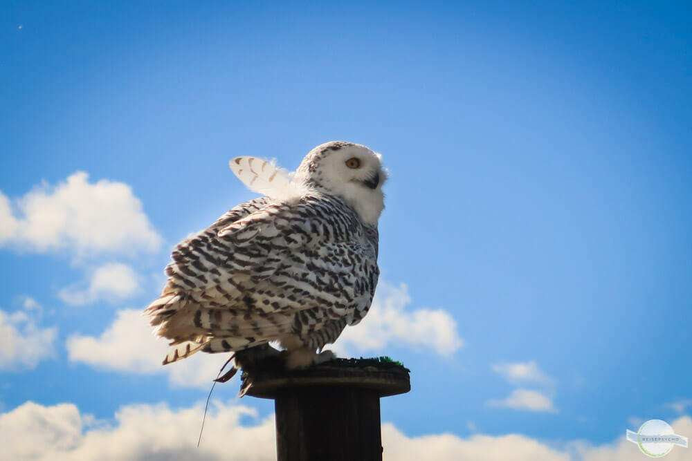 Die Schneeeule Flaumi genießt die Aussicht