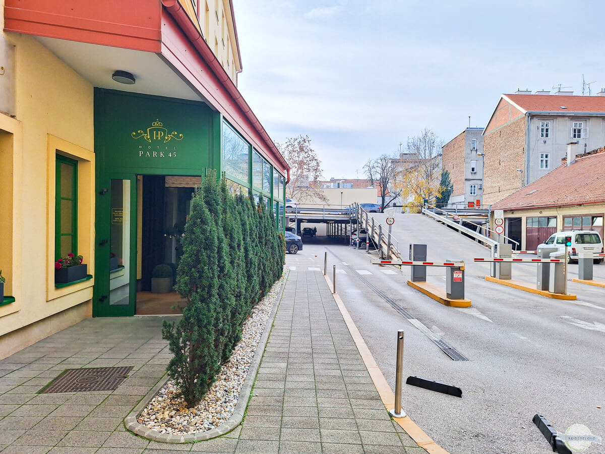 Der Parkplatz und der Eingang ins Hotel Park 45